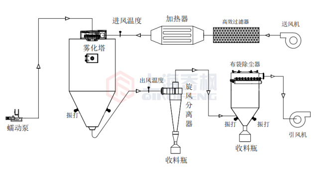 特點2、噴霧干燥機生產能力大,產品質量高,干燥機處理量大。雖然干燥介質的入口溫度可達數百攝氏度,但在整個干燥過程的大部分時間內,材料溫度不超過空氣中的濕球溫度。因此,噴霧干燥機也適用于干燥熱敏性材料(如食品、藥品、生物制品和染料等)。