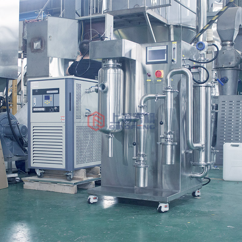 首先,液態(tài)物質(zhì)被送入噴霧器中,在高速噴嘴的作用下,噴出微小的顆粒狀物料形成霧滴,然后這些霧滴在干燥室中與高溫高壓的熱風(fēng)相互作用。在瞬間高溫高壓作用下,霧滴逐漸失去水分,由此升高了氣體的濕度,并在空氣的擾動(dòng)和攪拌下,將干燥室內(nèi)氣體的溫度和濕度保持在一定的范圍內(nèi)。